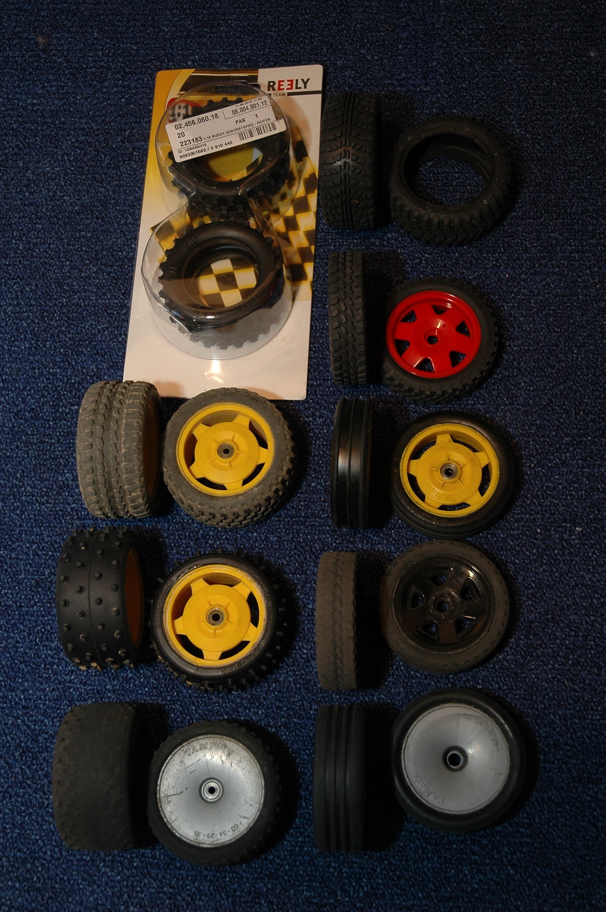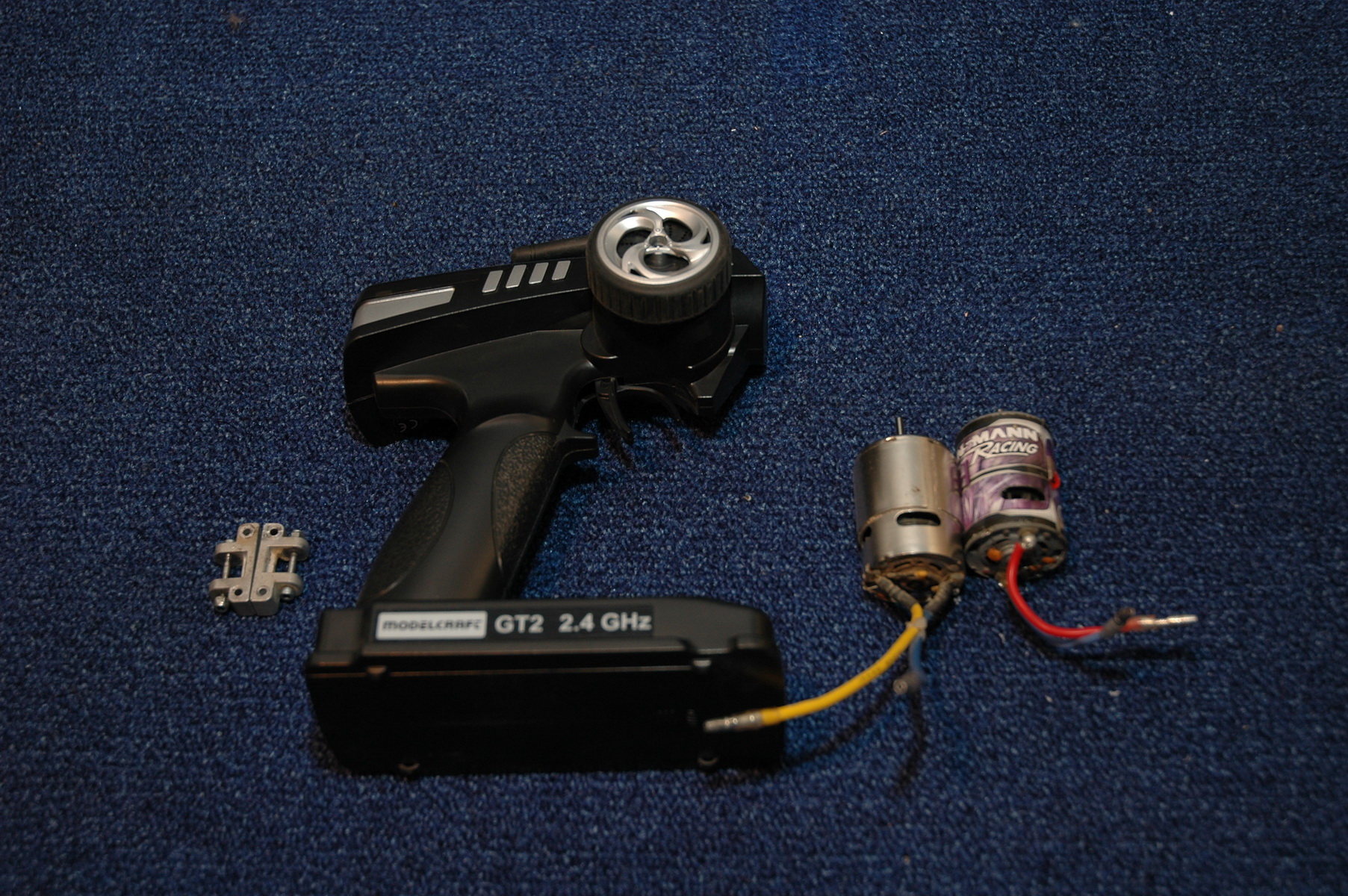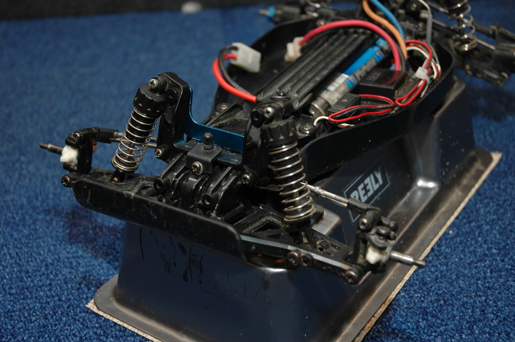 Der DT-02 von Tamiya ist ein tolles Einsteigerauto, welches von mir bereits mit einigem sinnvollen Tuning ausgerüstet wurde. Zunächst einmal handelt es sich hier um die Bausatzversion, welche schon von Hause aus besser ausgerüstet ist. So sind alle Gleitlager durch Kugellager ersetzt und das Auto bereits mit Öldruckstoßdämpfern ausgestattet (diese sind zur Zeit nicht gefüllt). Des Weiteren habe ich die Standartspurstangen durch die Stangen aus dem Zubehör ersetzt, welches das Einstellen der Spur am Fahrzeug sehr erleichtert. Die hinteren Radmitnehmer wurden durch welche aus Alu ersetzt und die vordere Dämpferbrücke mit der Aluverstärkung versehen. Das Fahrzeug darf so, wie es jetzt aufgebaut ist im Tamiya Cup gefahren werden. Neben dem Regler TEU-101BK ist der Original Motor und ein Servo von HPI (SF-1) verbaut. Zum Lieferumfang gehören weiterhin ein Satz Alu C-Hubs und 2 Motoren (ein Standart- und ein Tuningmotor, dieser allerdings ohne Funktionsgarantie), sowie diverse Reifen (teils neu, teils abgefahren), Felgen sowie diverse Ersatzteile. Als Funke kommt eine 2,4 GHz von Modelcraft mit entsprechendem Empfänger zum Einsatz. Einen Akku (NiMh) lege ich ebenfalls bei. Alles was Sie also noch benötigen sind 8 Batterien für den Sender, ein Ladegerät für den Fahrakku und etwas Platz