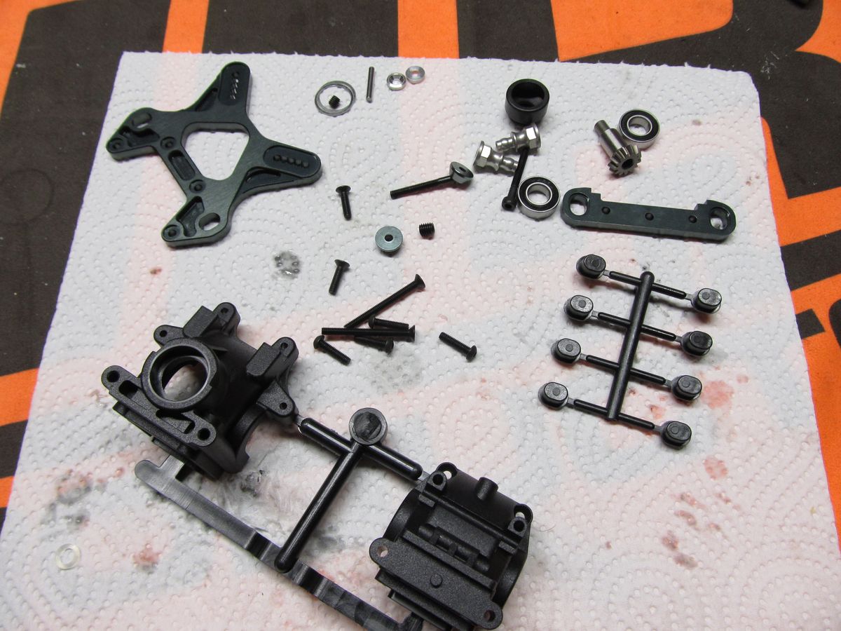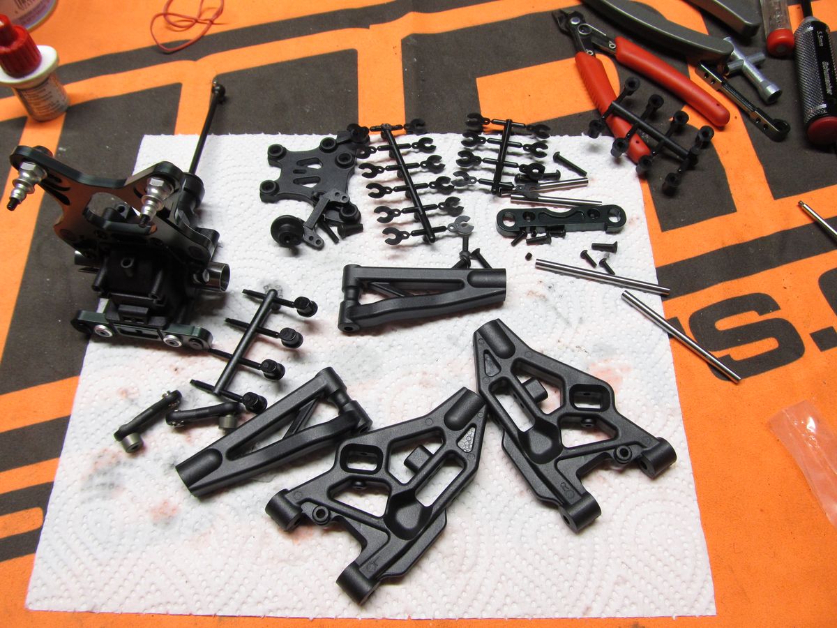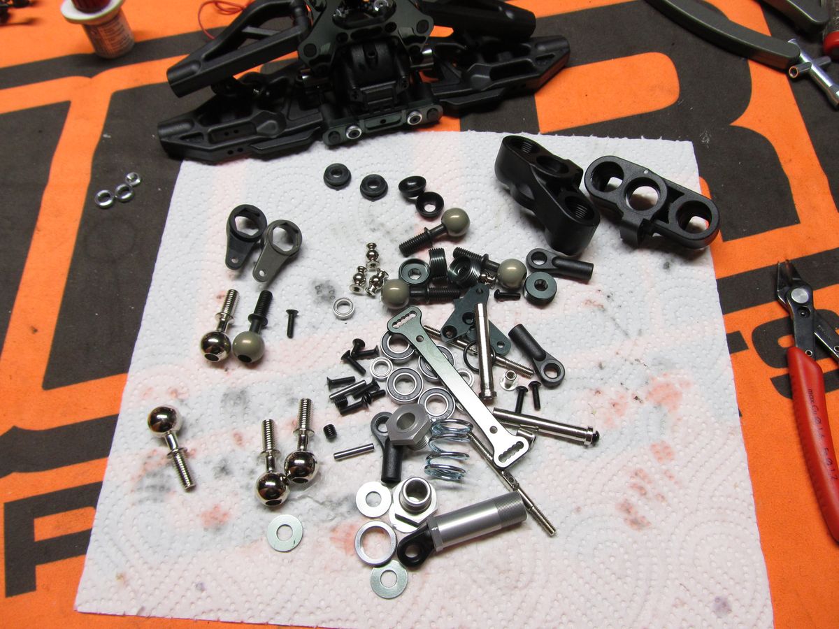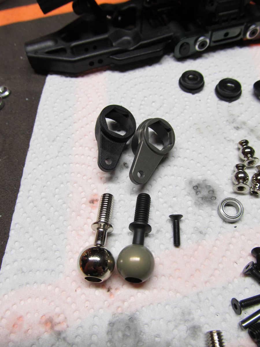 Und weiter geht es mit der nächsten Tüte. Zu sehen sind die Pivotball-Radträger, die dazugehörigen Kugelköpfe links im Bild in verschiedener Ausführung (Erklärung gleich) und der Servosaferhebel in verschiedener Ausführung.