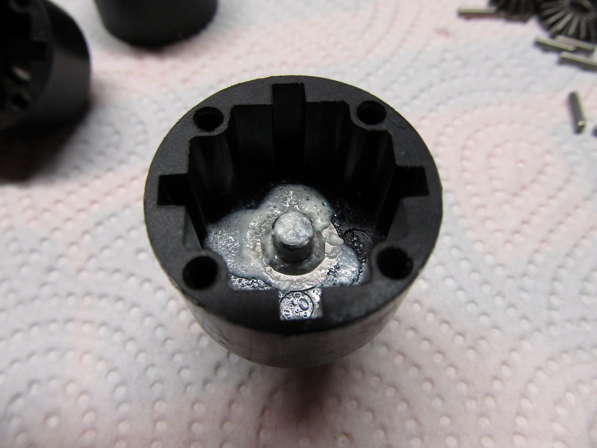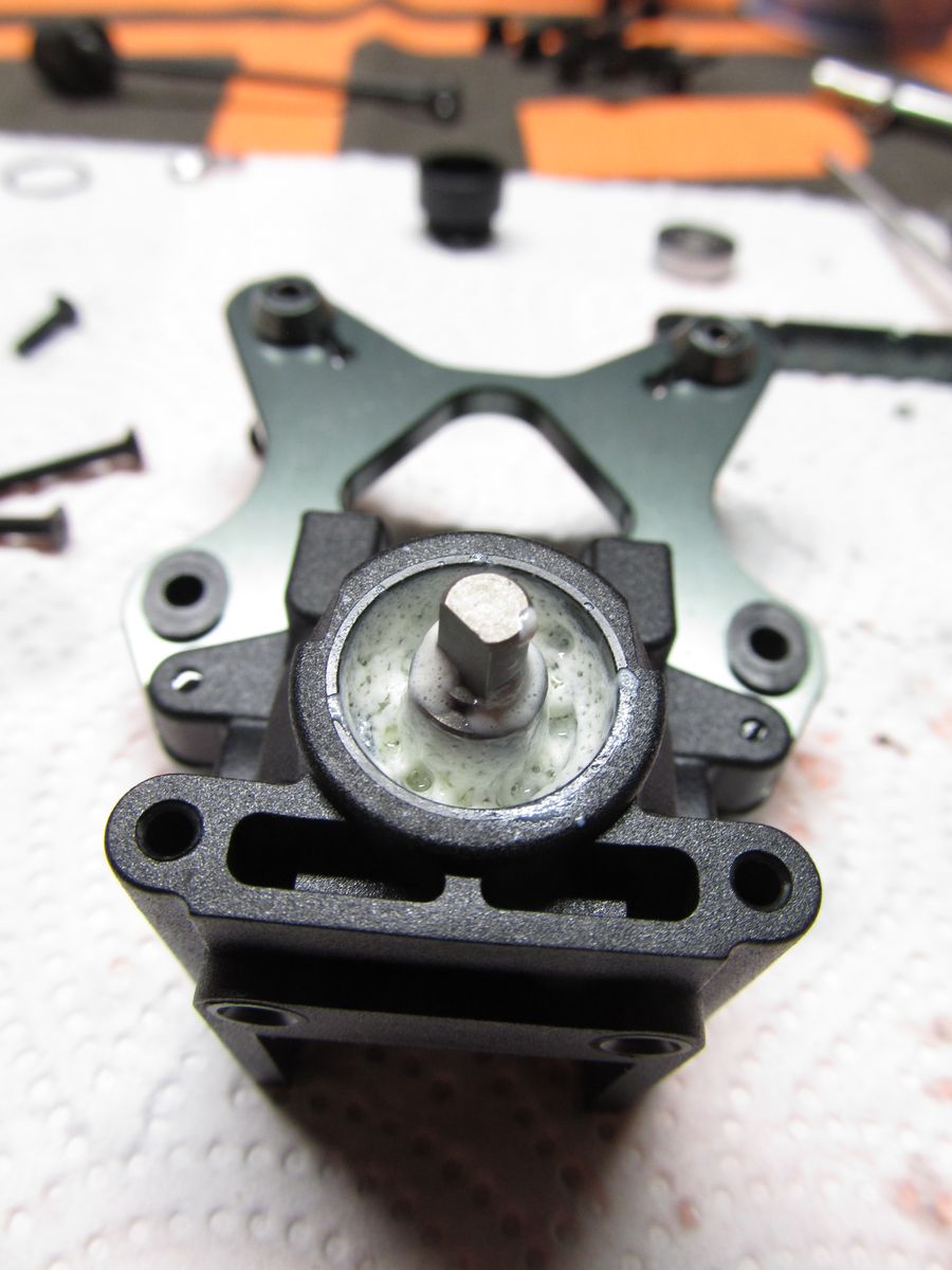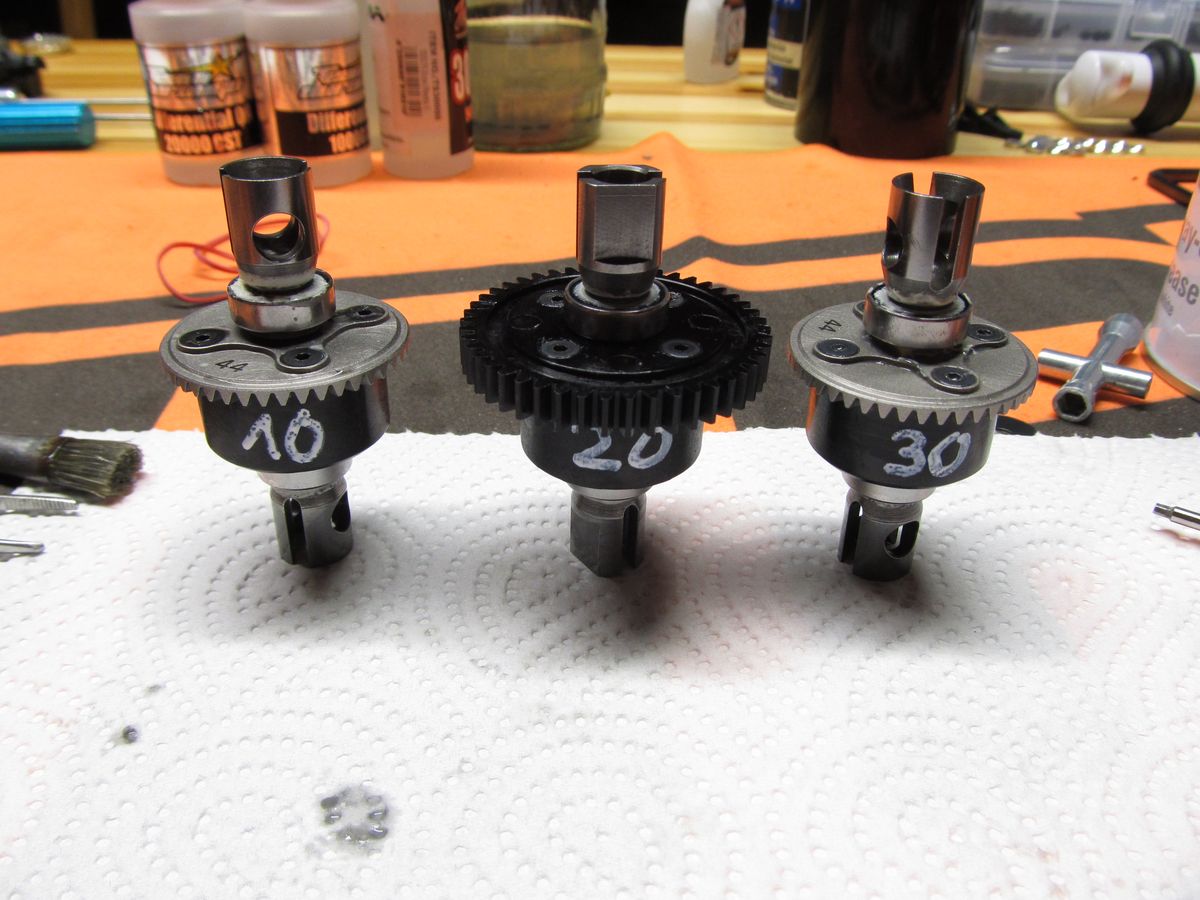 Das erste Diff ist befüllt. Hier ist 30000er Öl drinnen für das Erfurter Messerennen auf Teppich. Ich bin Fan von voll befüllten Diffs, doch bei dem dicken Öl muss man aufpassen! Es kann beim Zusammenschrauben nicht so einfach zwischen Gehäuse und Tellerrad auslaufen. Deshalb muss der Füllstand korrigiert werden, falls es sich andeutet, dass zu viel Öl im Diff ist. Nach dem Zusammenschrauben muss es sich trotzdem drehen lassen, ohne zu hakeln.