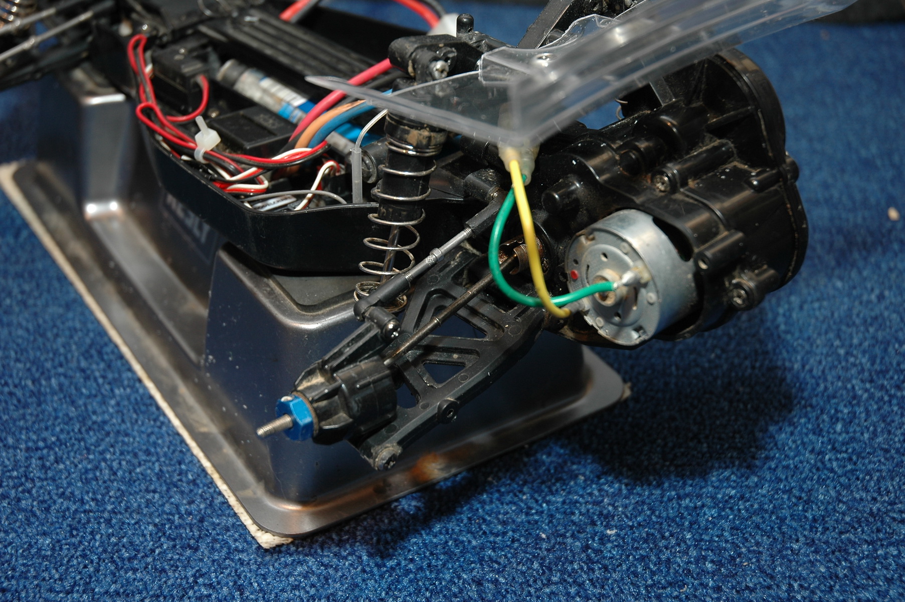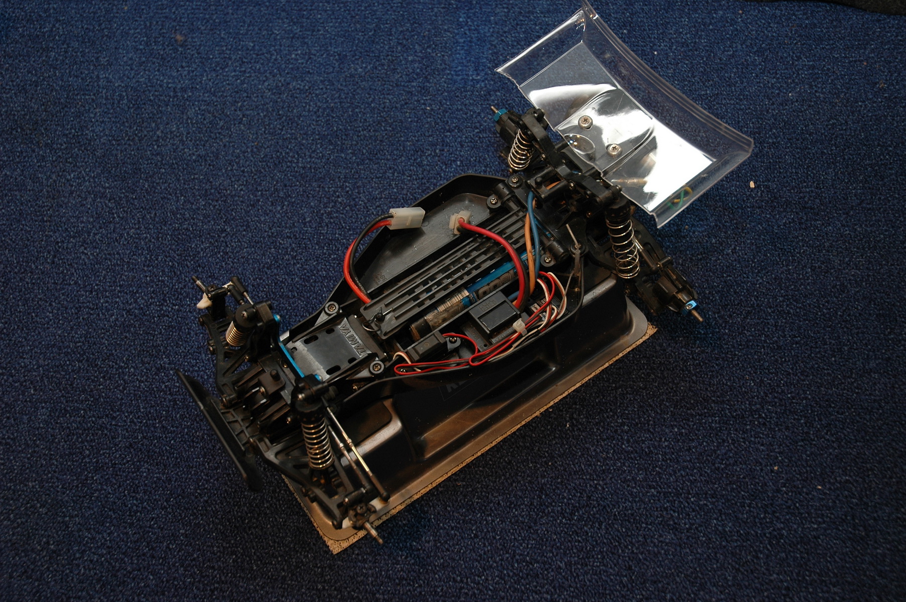 Der DT-02 von Tamiya ist ein tolles Einsteigerauto, welches von mir bereits mit einigem sinnvollen Tuning ausgerüstet wurde. Zunächst einmal handelt es sich hier um die Bausatzversion, welche schon von Hause aus besser ausgerüstet ist. So sind alle Gleitlager durch Kugellager ersetzt und das Auto bereits mit Öldruckstoßdämpfern ausgestattet (diese sind zur Zeit nicht gefüllt). Des Weiteren habe ich die Standartspurstangen durch die Stangen aus dem Zubehör ersetzt, welches das Einstellen der Spur am Fahrzeug sehr erleichtert. Die hinteren Radmitnehmer wurden durch welche aus Alu ersetzt und die vordere Dämpferbrücke mit der Aluverstärkung versehen. Das Fahrzeug darf so, wie es jetzt aufgebaut ist im Tamiya Cup gefahren werden. Neben dem Regler TEU-101BK ist der Original Motor und ein Servo von HPI (SF-1) verbaut. Zum Lieferumfang gehören weiterhin ein Satz Alu C-Hubs und 2 Motoren (ein Standart- und ein Tuningmotor, dieser allerdings ohne Funktionsgarantie), sowie diverse Reifen (teils neu, teils abgefahren), Felgen sowie diverse Ersatzteile. Als Funke kommt eine 2,4 GHz von Modelcraft mit entsprechendem Empfänger zum Einsatz. Einen Akku (NiMh) lege ich ebenfalls bei. Alles was Sie also noch benötigen sind 8 Batterien für den Sender, ein Ladegerät für den Fahrakku und etwas Platz ;-)
