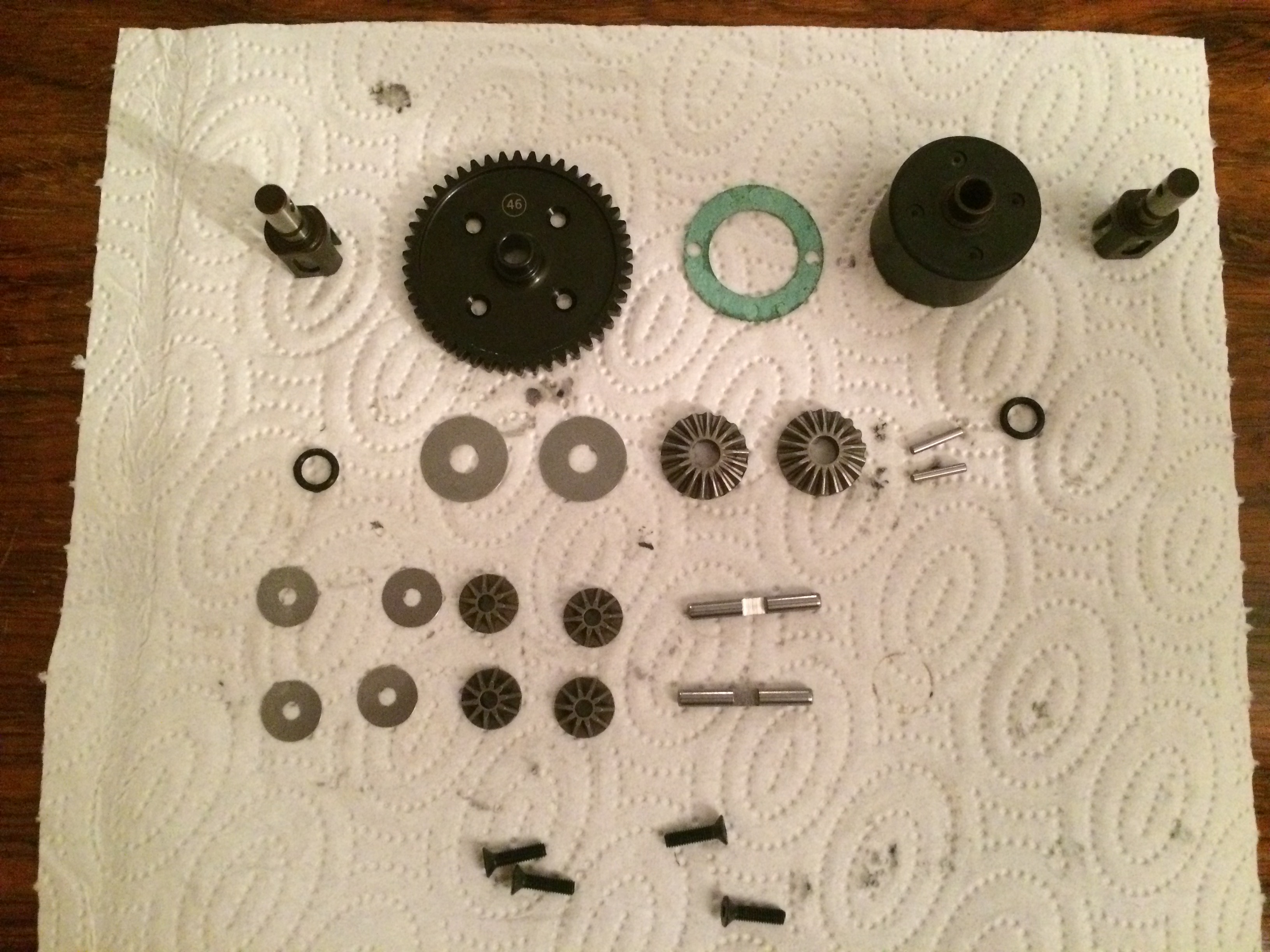 Das Mitteldiff ist eigentlich analog, hat aber natürlich das Hauptzahnrad und die abgeflachten Outdrives( für die nicht vorhandenen Bremsscheiben) als Unterschied..
