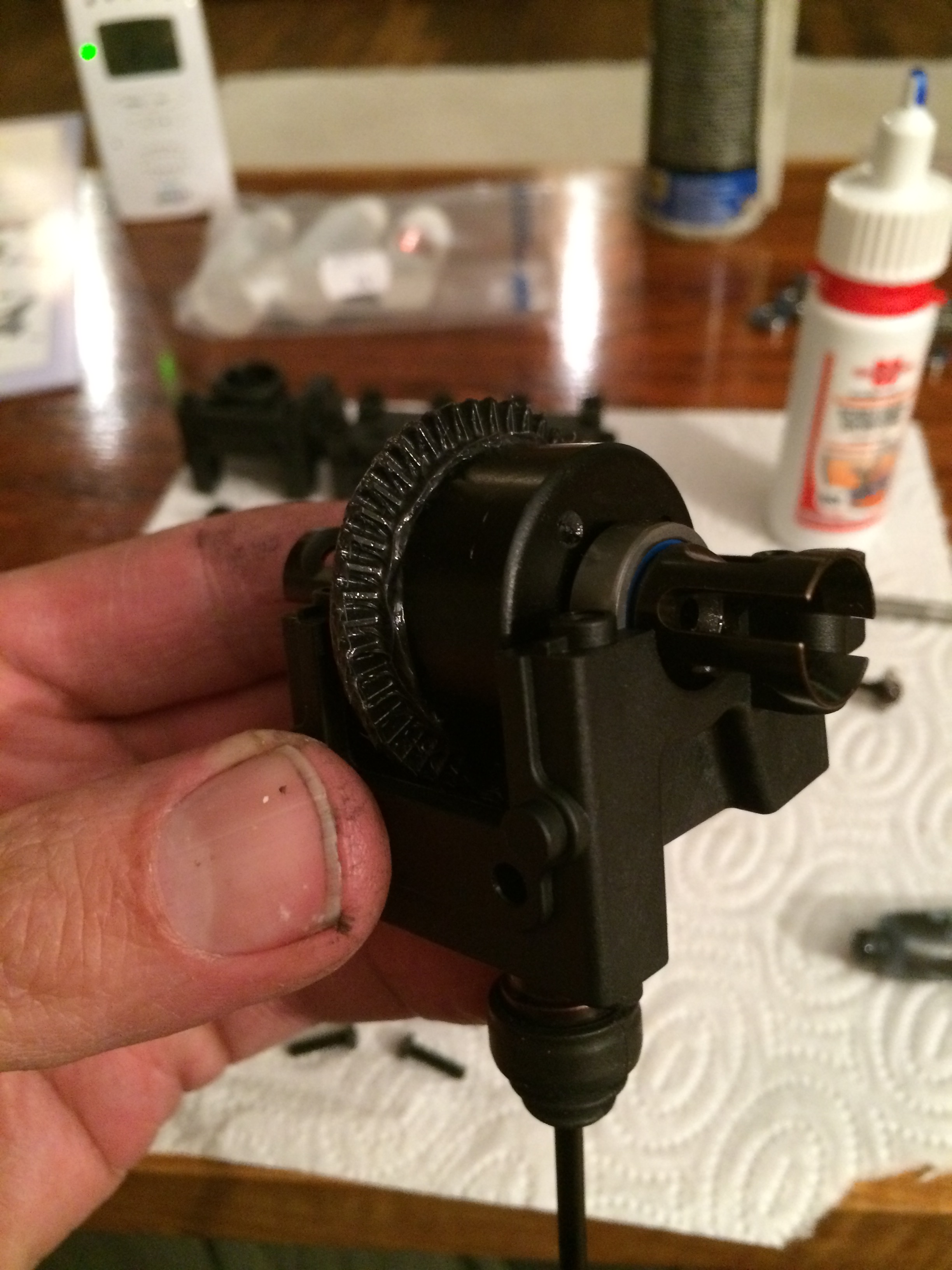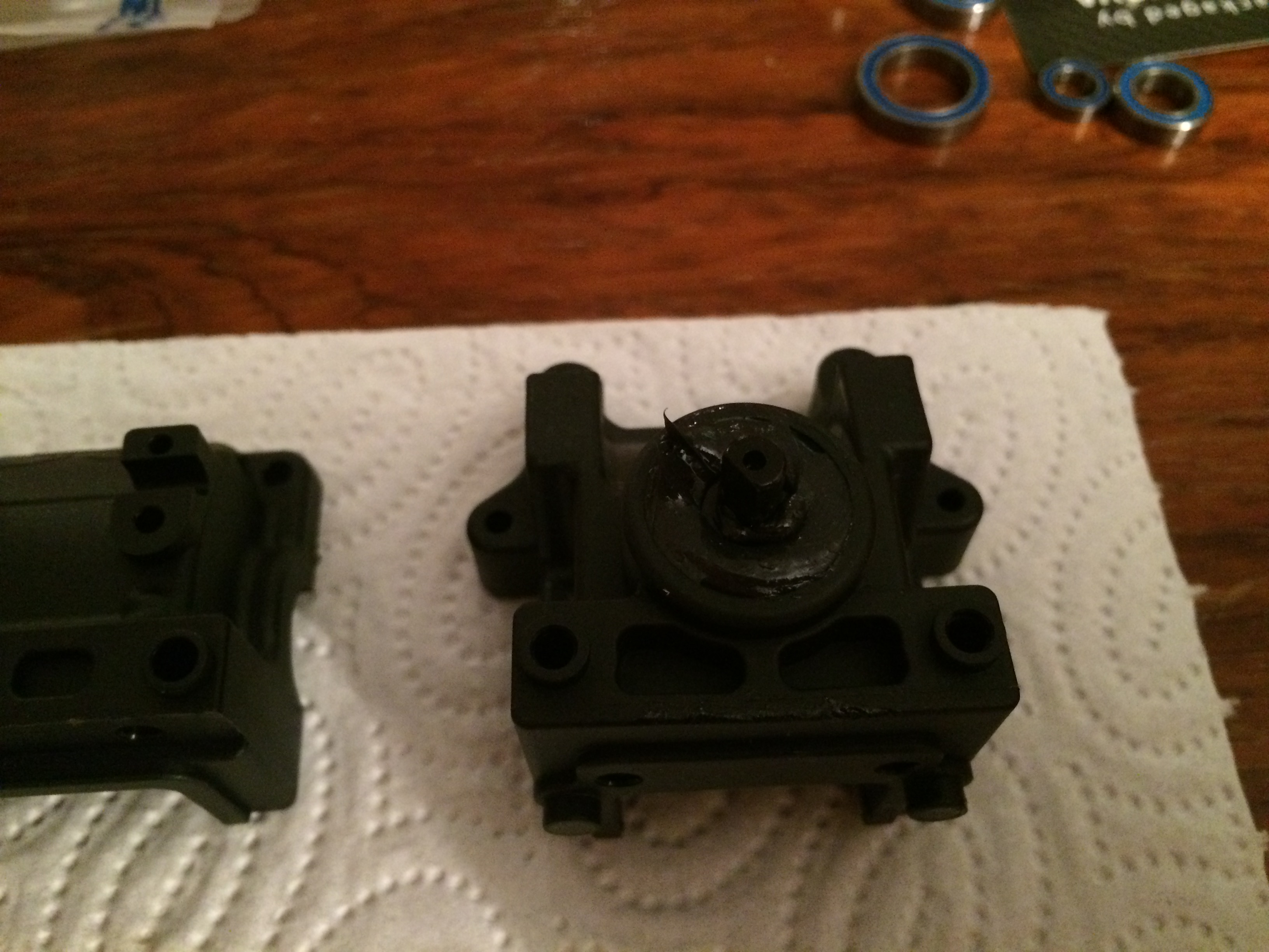 Dann kommen die Diffs ins Gehäuse geshimmt- bei Xray eine einfache Sache- am Anfang kommt ein Ring auf die gegenüberliegende Seite des Tellerrades nach einem oder zwei Rennen gehts dann auf die andere Seite und verändert sich dann auch nicht mehr- ordentliche Wartung vorrausgesetzt !