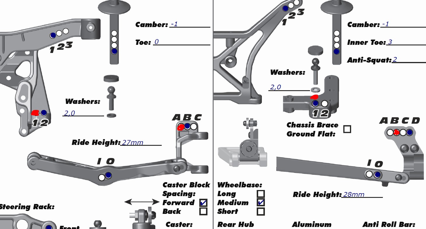 Frage: Was passiert bzw wie verhält sich das Fahrzeug wenn ich die Spurstangen vorn und hinten von blau auf rot (Punkte auf dem Bild) ändere?