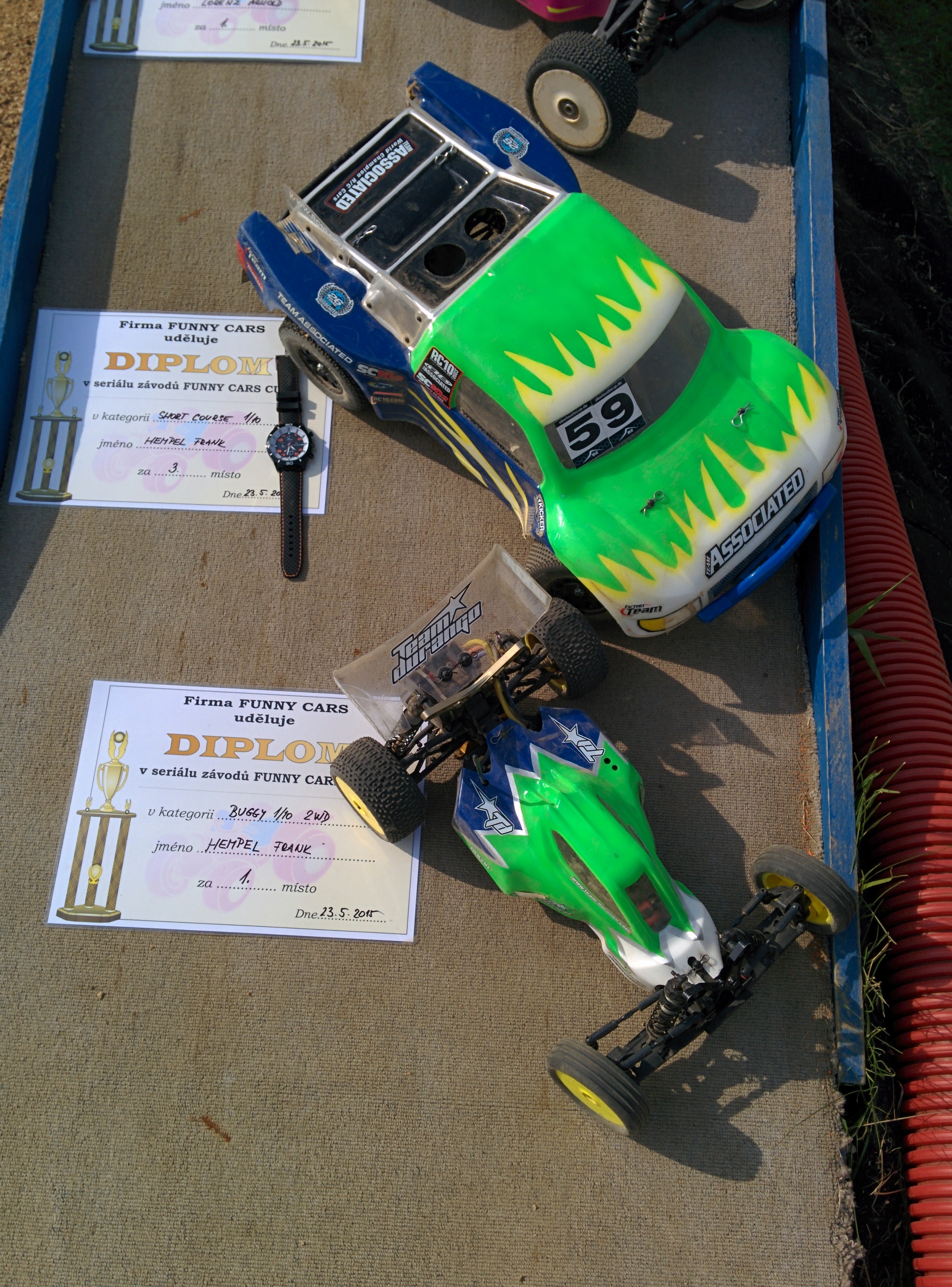 Heute früh bei schönen Sonnenschein trafen sich 3 Man(n) vom MBC Oberlausitz ( Arnold, Thomas und Frank) um zum FunnycarsCup nach Mnisek bei Liberce (CZ) zu fahren. Pünktlich 7:00 war das Auto gepackt und es konnte von Obercunnersdorf aus losgehen. Es waren "nur" 50km bis Mnisek und so waren wir kurz vor 8 Uhr da. Nach kurzem Aufbau des Pavillon, ging es an die ersten Testfahrten auf der eigentlichen 1:5er Strecke. Arnold und Thomas starteten mit 1:8 Buggy Elektro, ich selbst startete mit dem Short Course und dem 2WD Buggy.